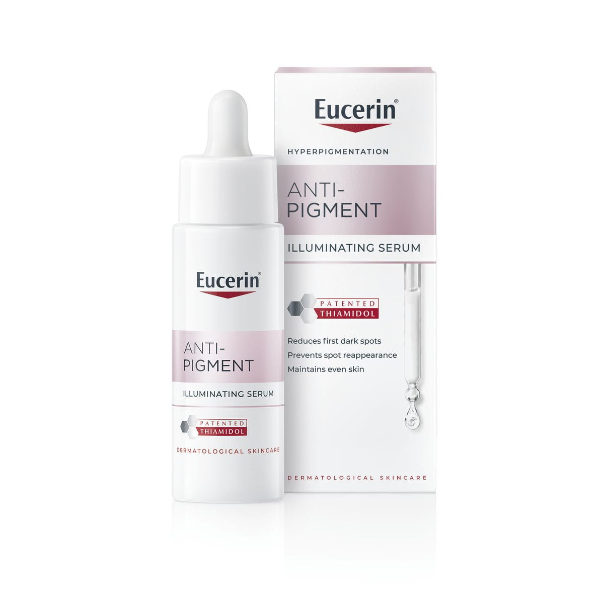 Eucerin Anti-Pigment Skin Perfecting Serum contains concentrated Hyaluronic Acid which improves skin moisturisation. It is effective when used individually, as part of your current skincare routine, or alongside other products in the Eucerin Anti-Pigment range.