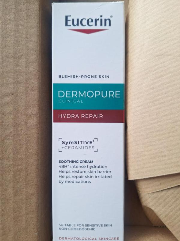 Eucerin DERMOPURE CLINICAL Hydra Repair is recommended by dermatologists and is clinically proven to help repair the skin barrier, particularly during the use of drying acne treatments. Formulated with SymSitive™ and ceramides, it provides: