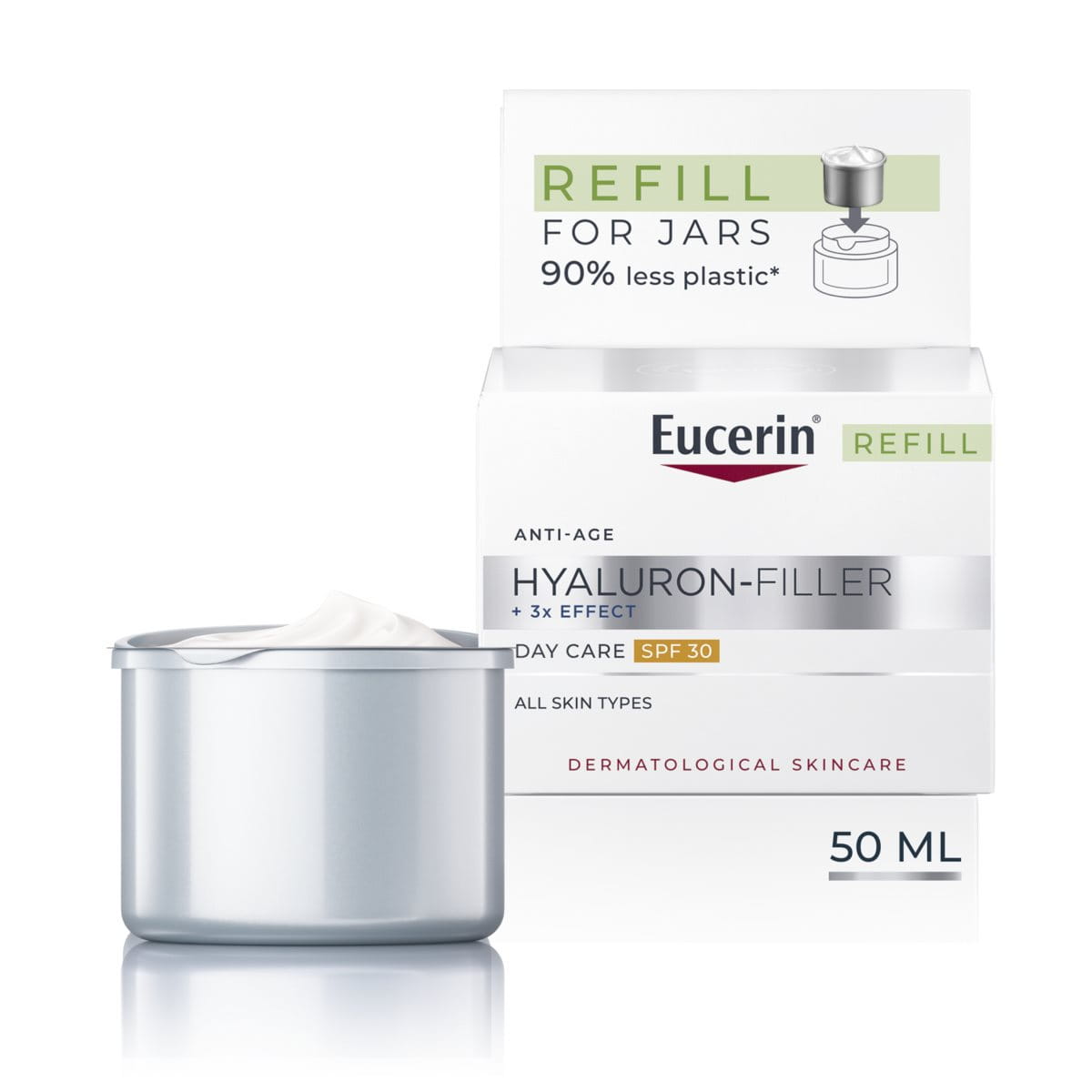 This Hyaluron-Filler +3x Effect Day Care SPF 30 Refill contains 90% less plastic compared to the regular Eucerin Face Care jar. By using this refill, you can help reduce plastic waste and contribute towards a more sustainable product cycle. Compatible with all Eucerin Face Care jars.
