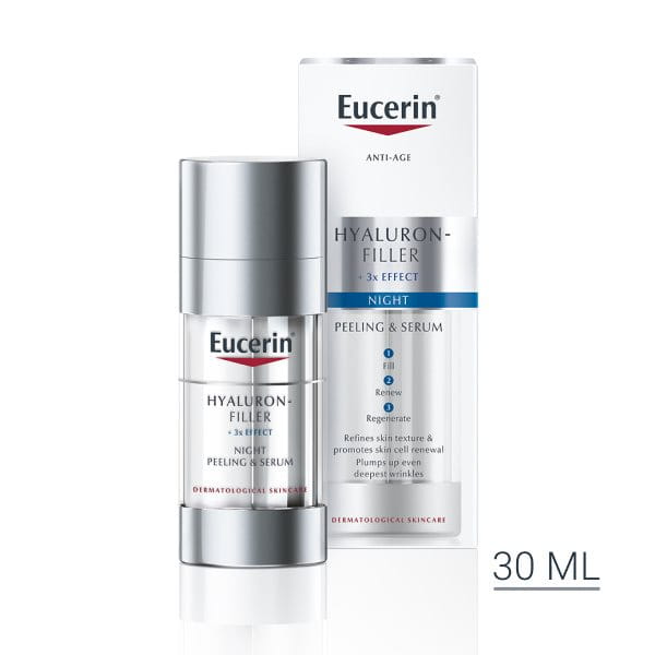 The two formulas combine on your skin to make it feel smooth. This innovative product is designed to be used overnight and, when used regularly, Eucerin Hyaluron-Filler Night Peeling & Serum is clinically and dermatologically proven to refine skin texture and promote skin renewal while plumping up even the deepest wrinkles.