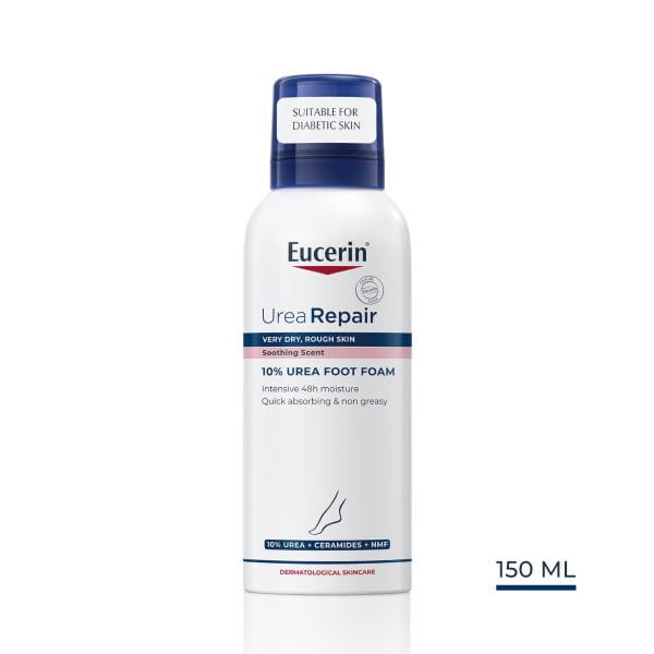 The soles of our feet work hard, with the skin purposely developed to be thicker and harder than elsewhere on our body to withstand daily life. It helps protect us, but can also be prone to dryness as a result. Impractical footwear, pressure, friction and stresses to the skin can cause feet, especially the heel pads, to become very rough and dry over time. Eucerin UreaRepair PLUS 10% Urea Foot Foam treats rough and dry skin on feet with intense moisturisation to provide immediate relief. This foot care product combines key ingredients to powerfully treat dry skin with a targeted solution.